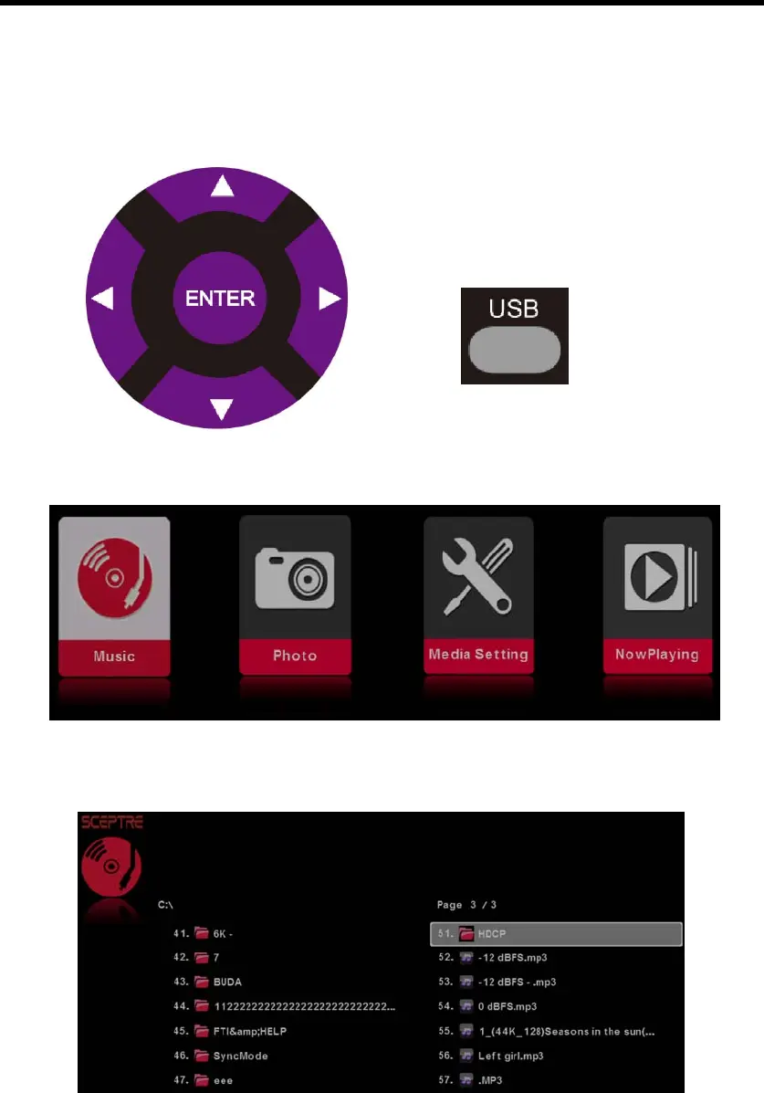 Once you press the USB button the USB menu will come up. Select either the music or picture you