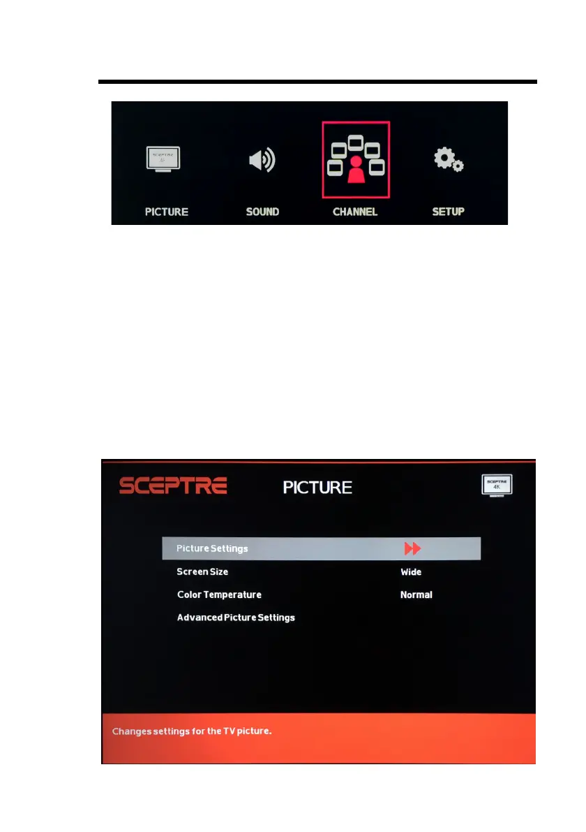 CHANNEL – This main option has functions for the tuner port, such as scanning