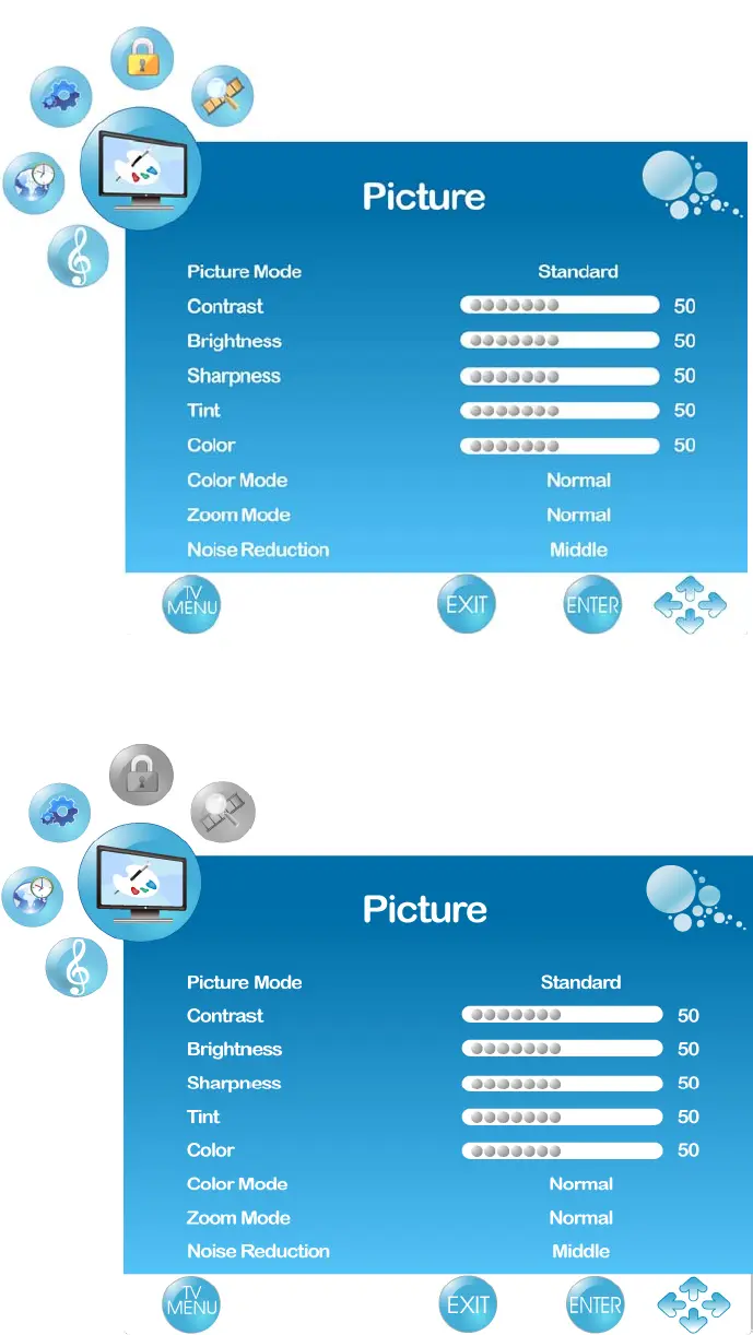 The follow picture represents the MENU seen under the sources AV, S-Video, YPbPr, HDMI1–3.