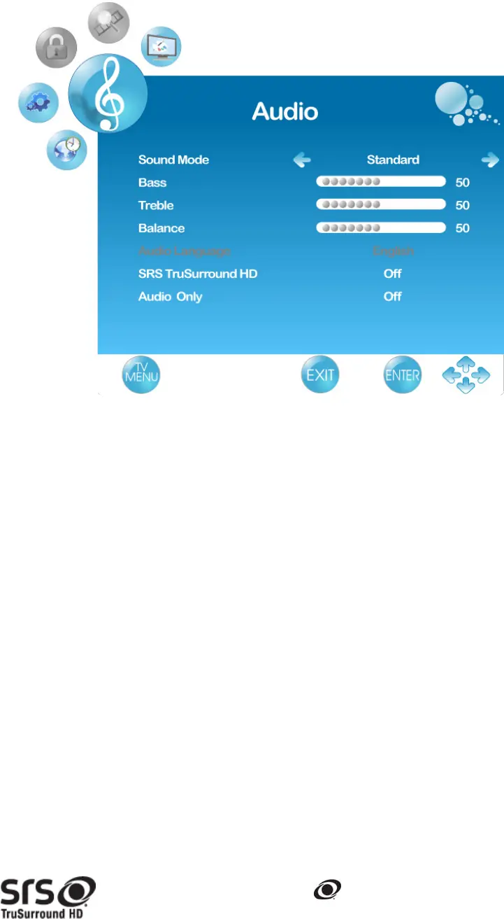 7. SRS TruSurround HD: To enjoy a concert hall effect, select “On” when stereo is