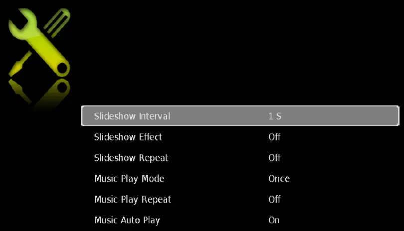1. SLIDESHOW INTERVAL – This option adjusts the time interval of a displayed picture.