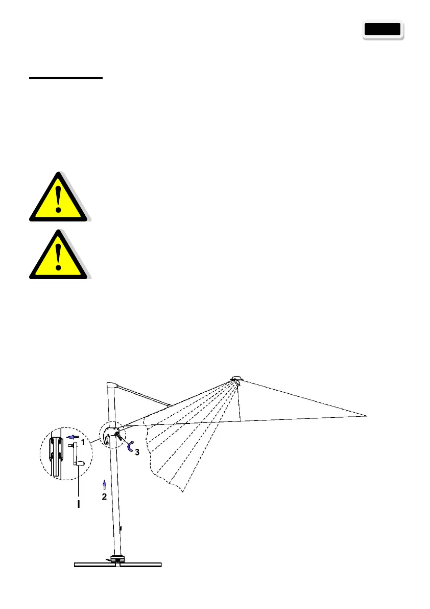 Zatiaľ čo otáčaním kľuky (I) otvárate slnečník, odblokujte ručnú páčku na