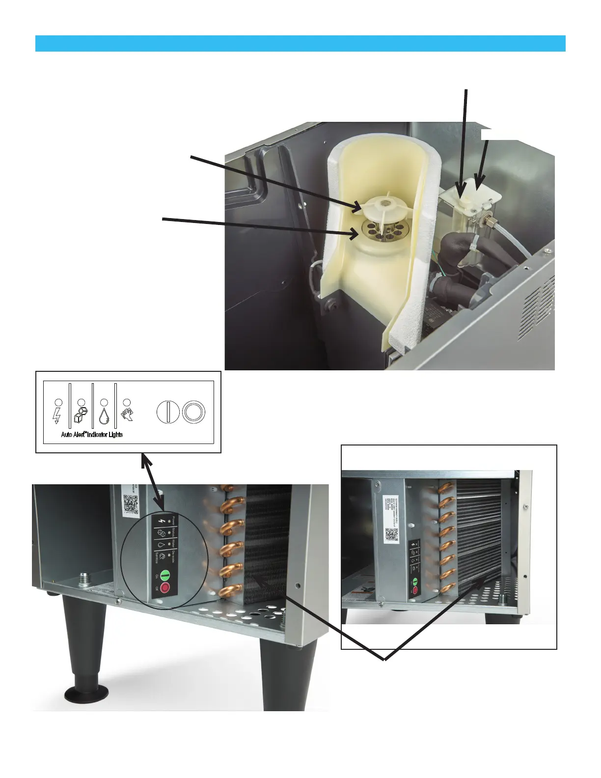 the on and o buttons, condenser ns, water reservoir and ice breaker.
