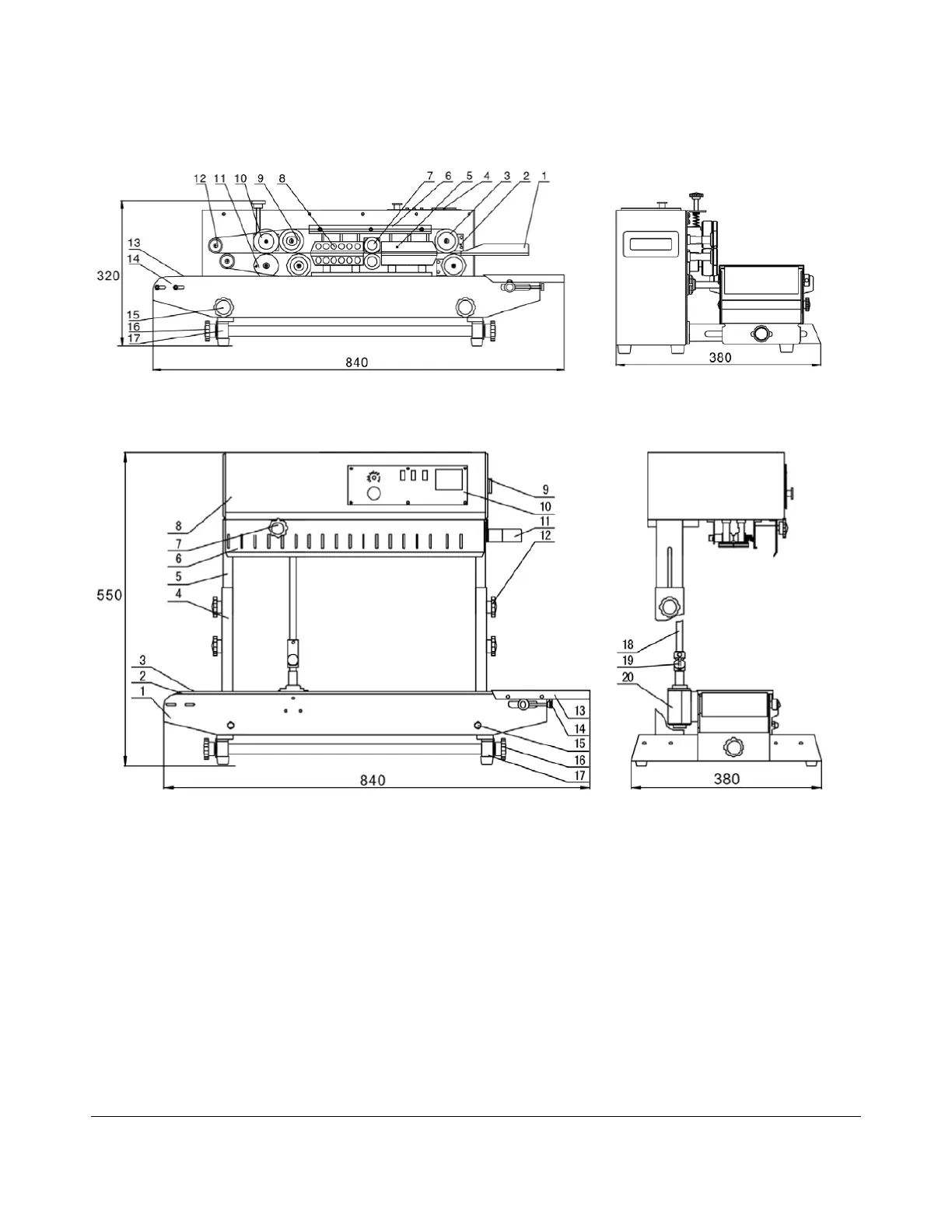 Figure 2. Vertical Band Sealer (1) Conveyor Table, (2) Driving Roller, (3) Conveyor Belt, (4) Fixed Bracket, (5) Slip Bracket, (6) Safety Cover, (7) Adjusting Knob for