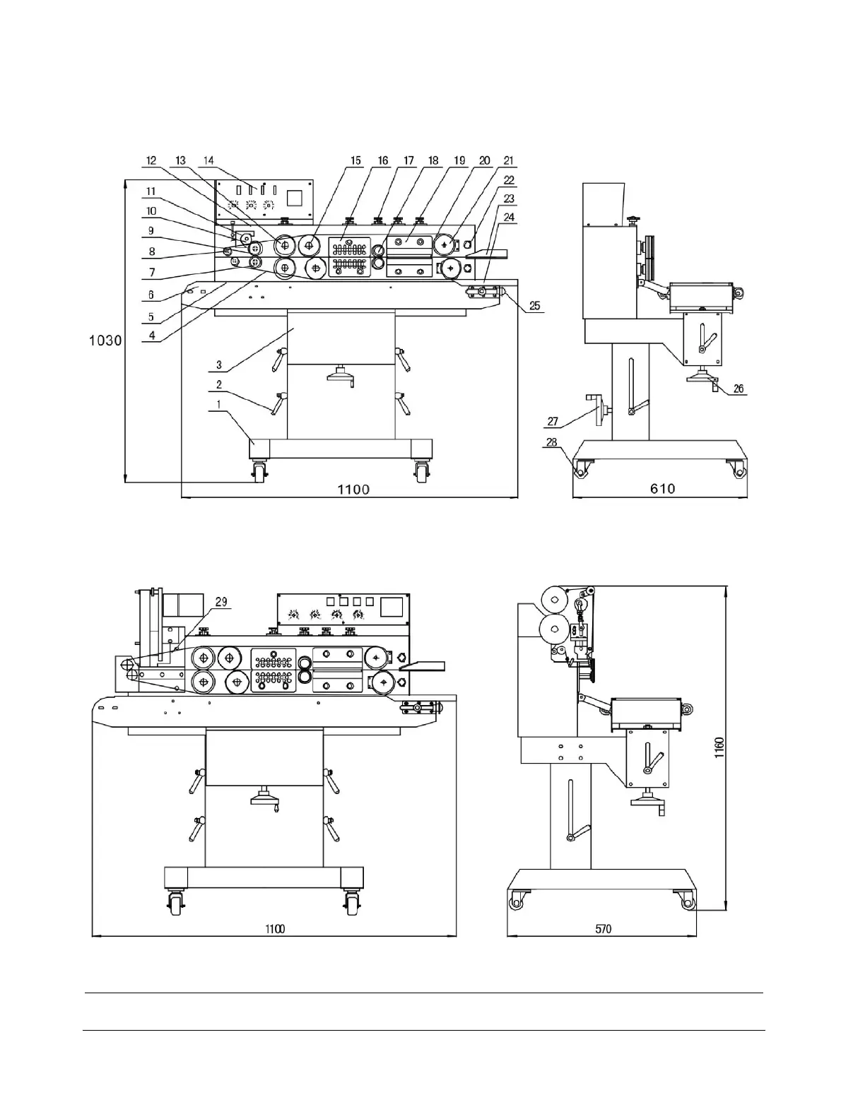 (24) Work Table, (25) Adjusting Knob for Conveyor, (26) Lifting Hand Wheel of Conveyor Table, (27) Lifting Hand Wheel of Complete Unit, (28) Casters