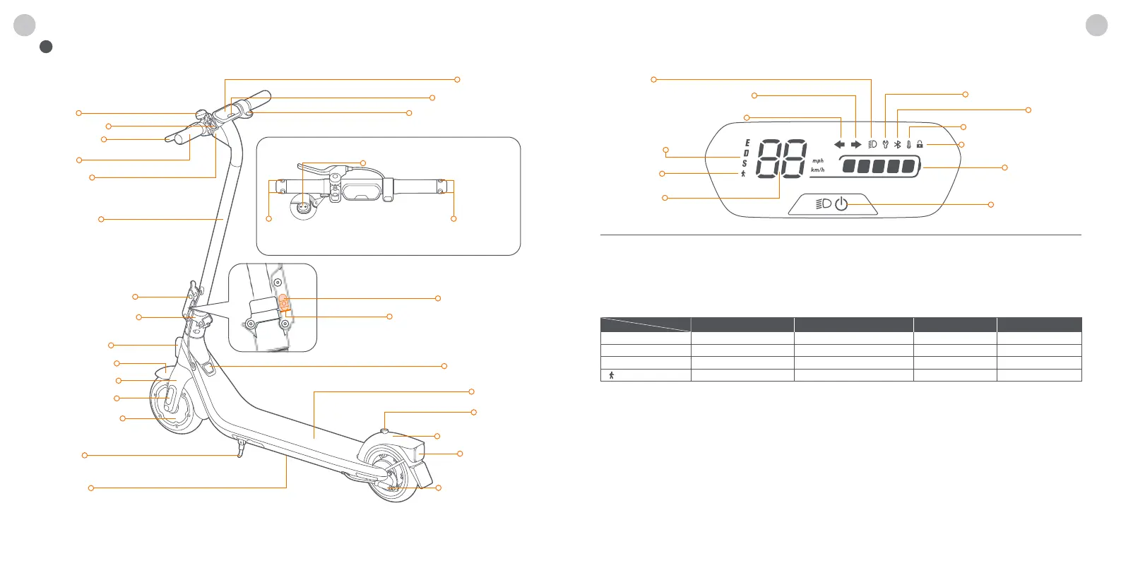 Tachometer: Er zeigt die aktuelle Geschwindigkeit des Rollers sowie Fehlercodes an. Laufmodus: Das Frontlicht