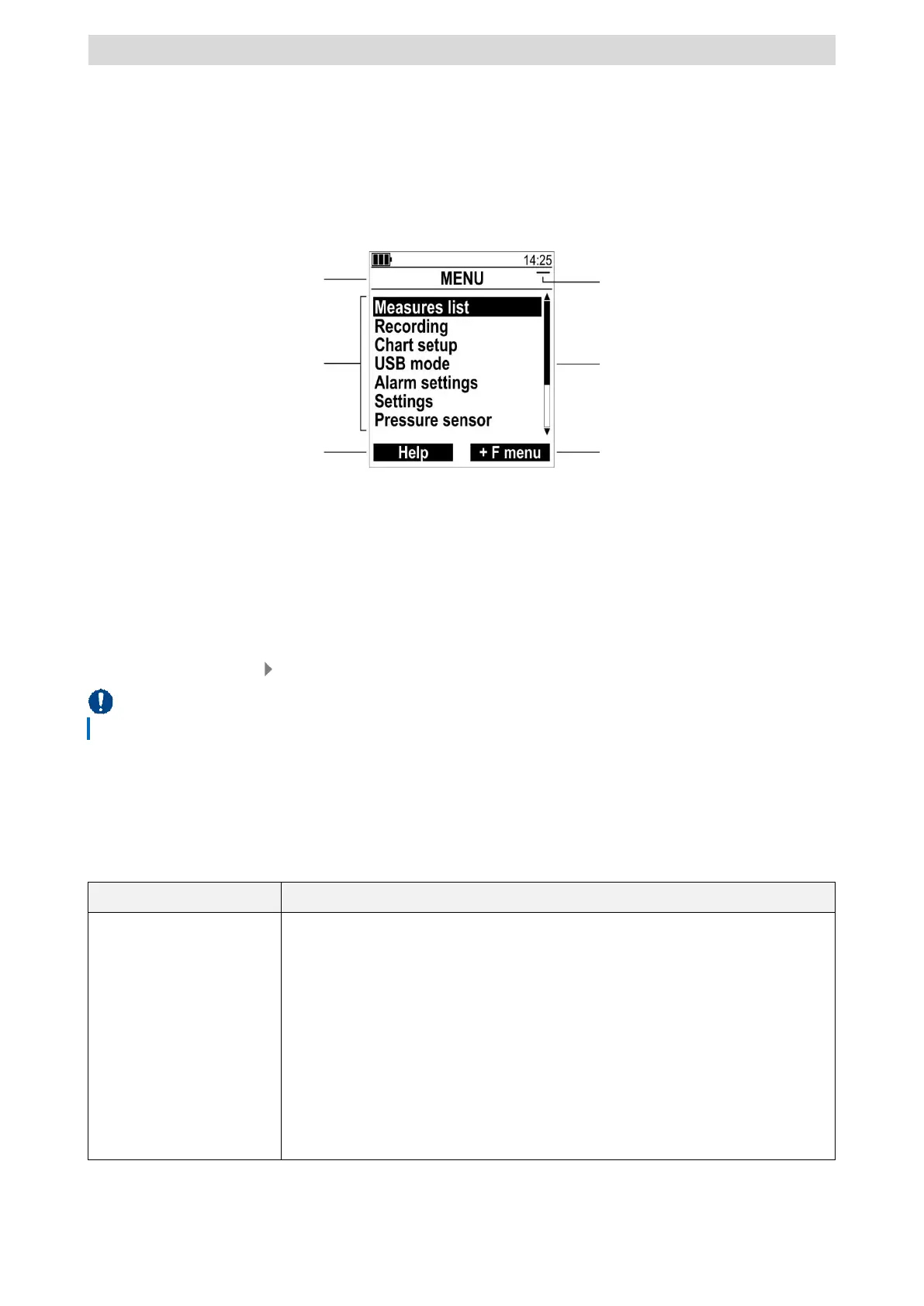 The menu structure is shown below; each item is preceded by the level according to the bar