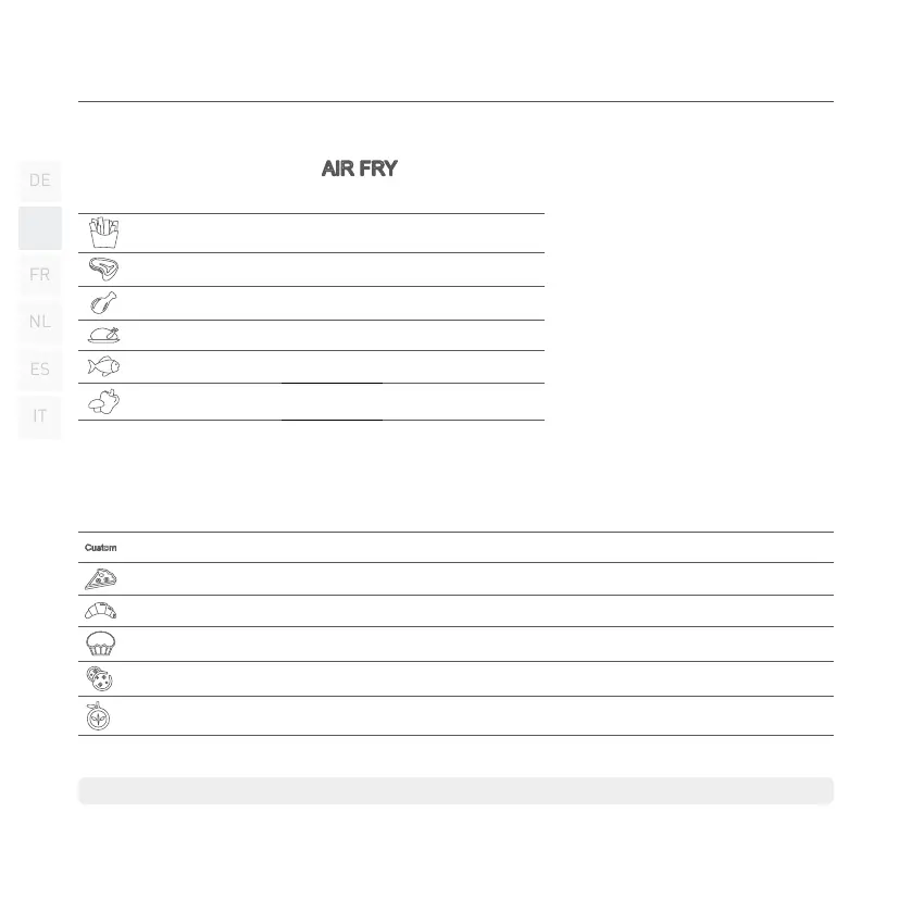 By pressing the AIR FRY button , the following preset programmes can be selected: