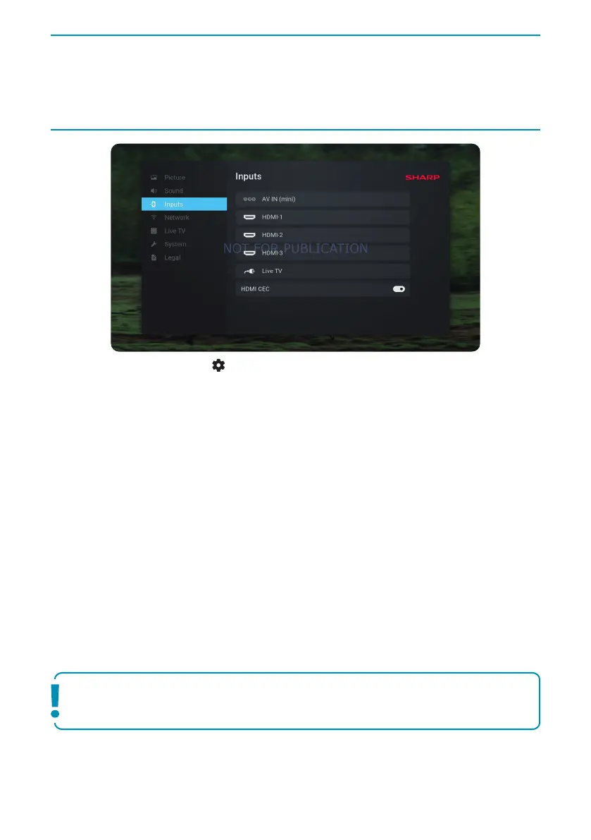 To access the Inputs menu, press the (settings) button on the remote and select [Inputs]. Please note that