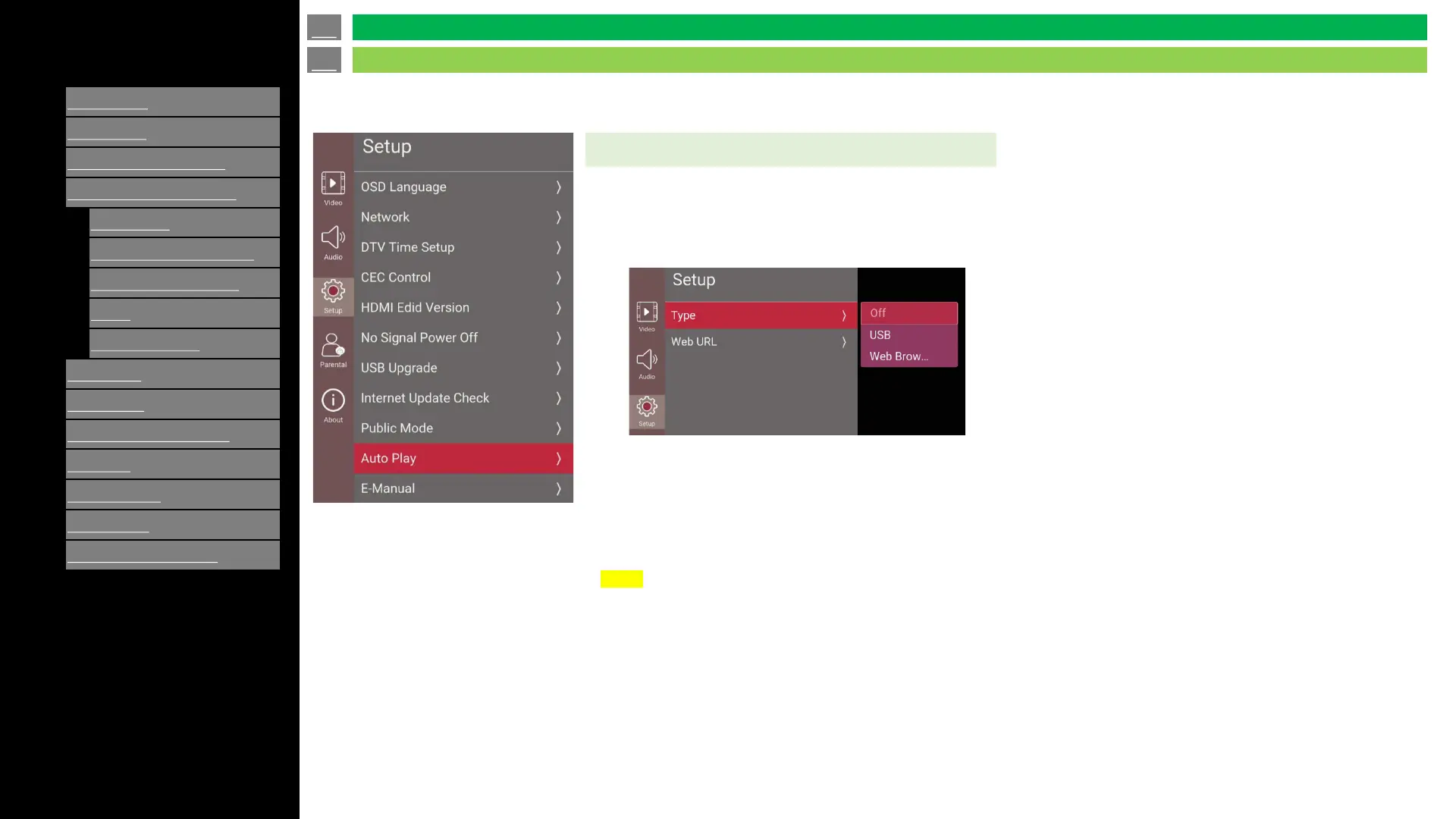Off: Disable AutoPlayUSB: After the power is turned on, the video is played back continuously or slide show of still images