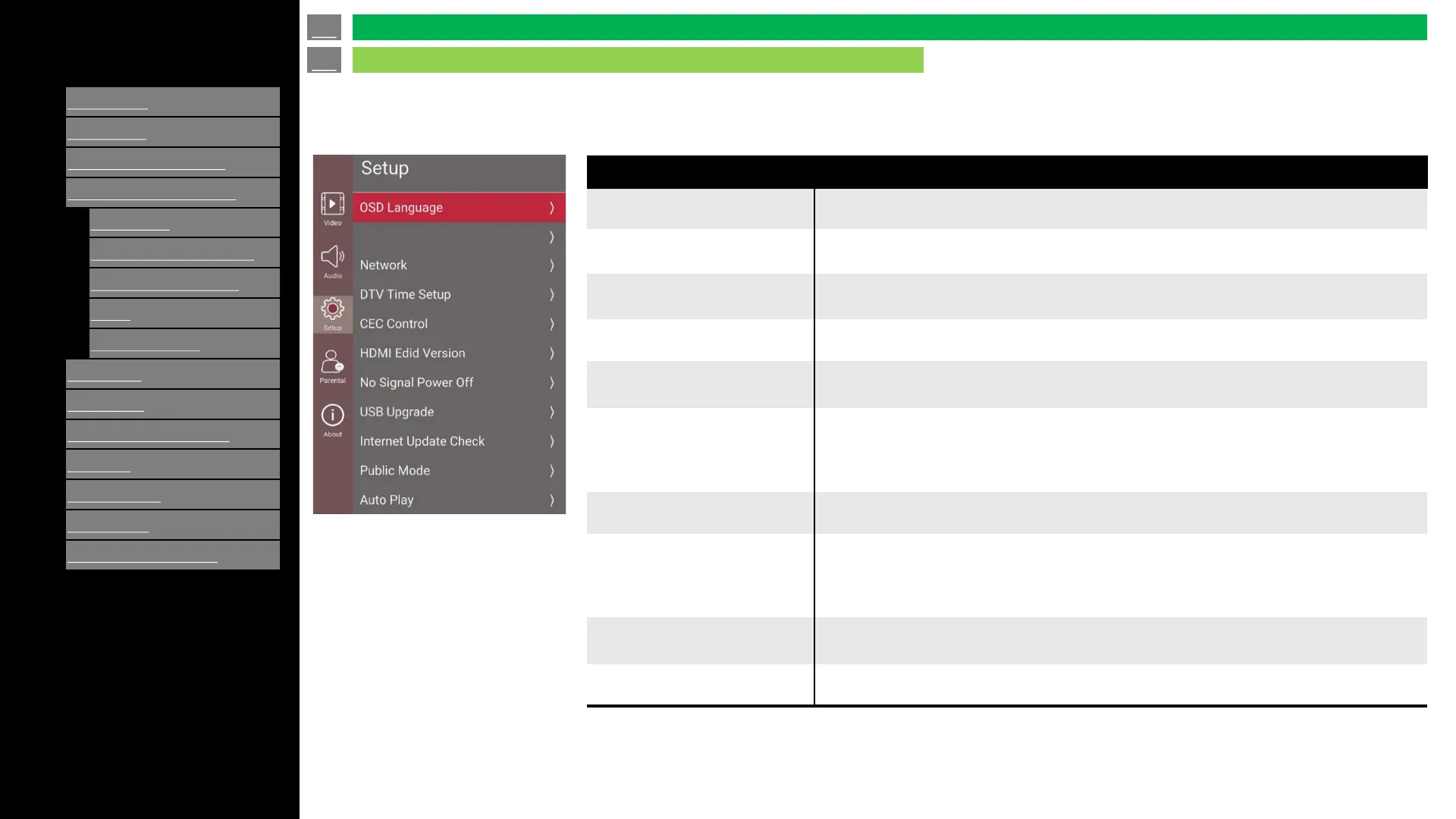 The menu Setup page provides OSD Language, Network, DTV Time Setup, CEC Control, HDMI EDID Version,