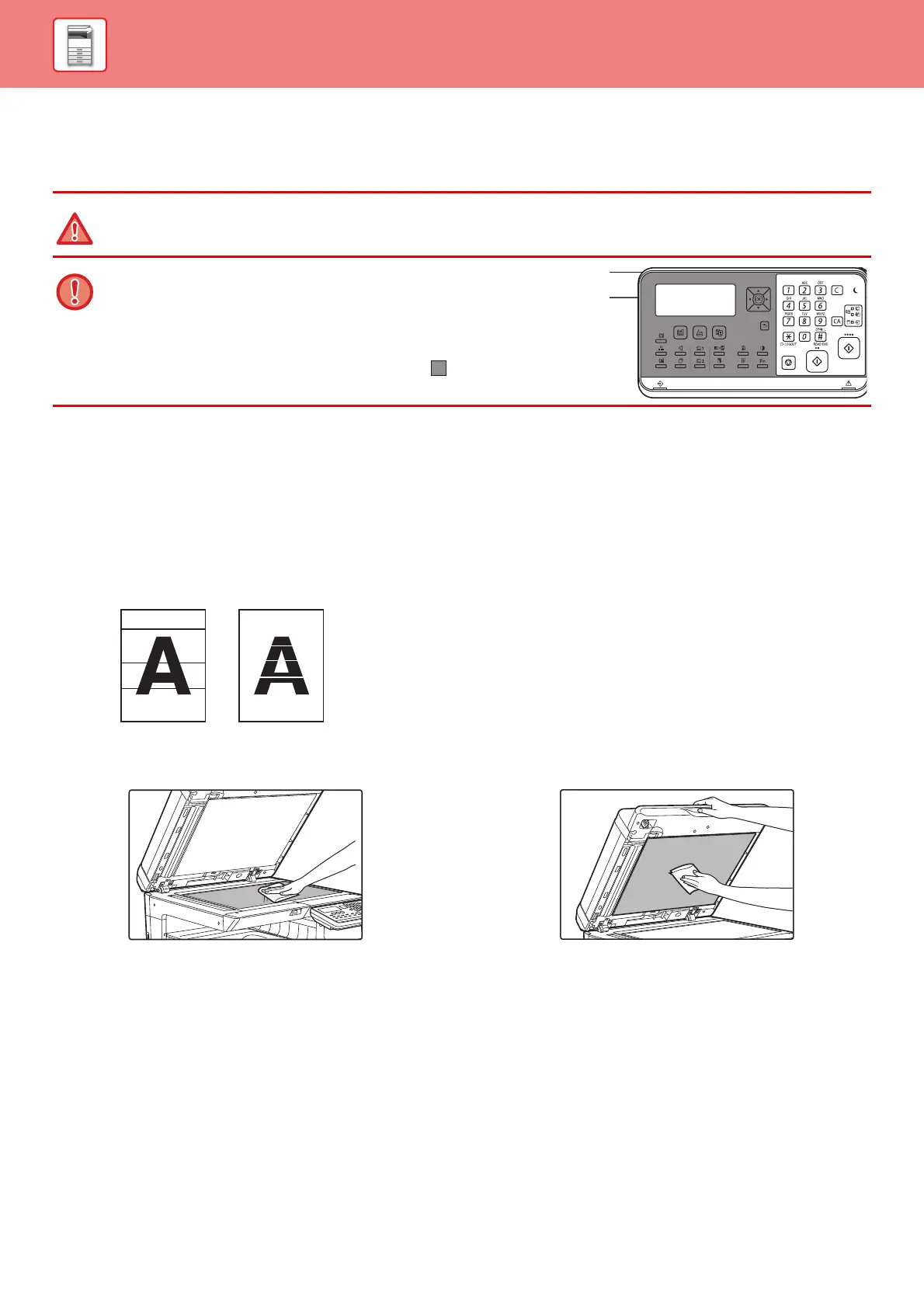 If the document glass or document backplate sheet becomes dirty, the dirt will appear as dirty spots, coloured lines, or