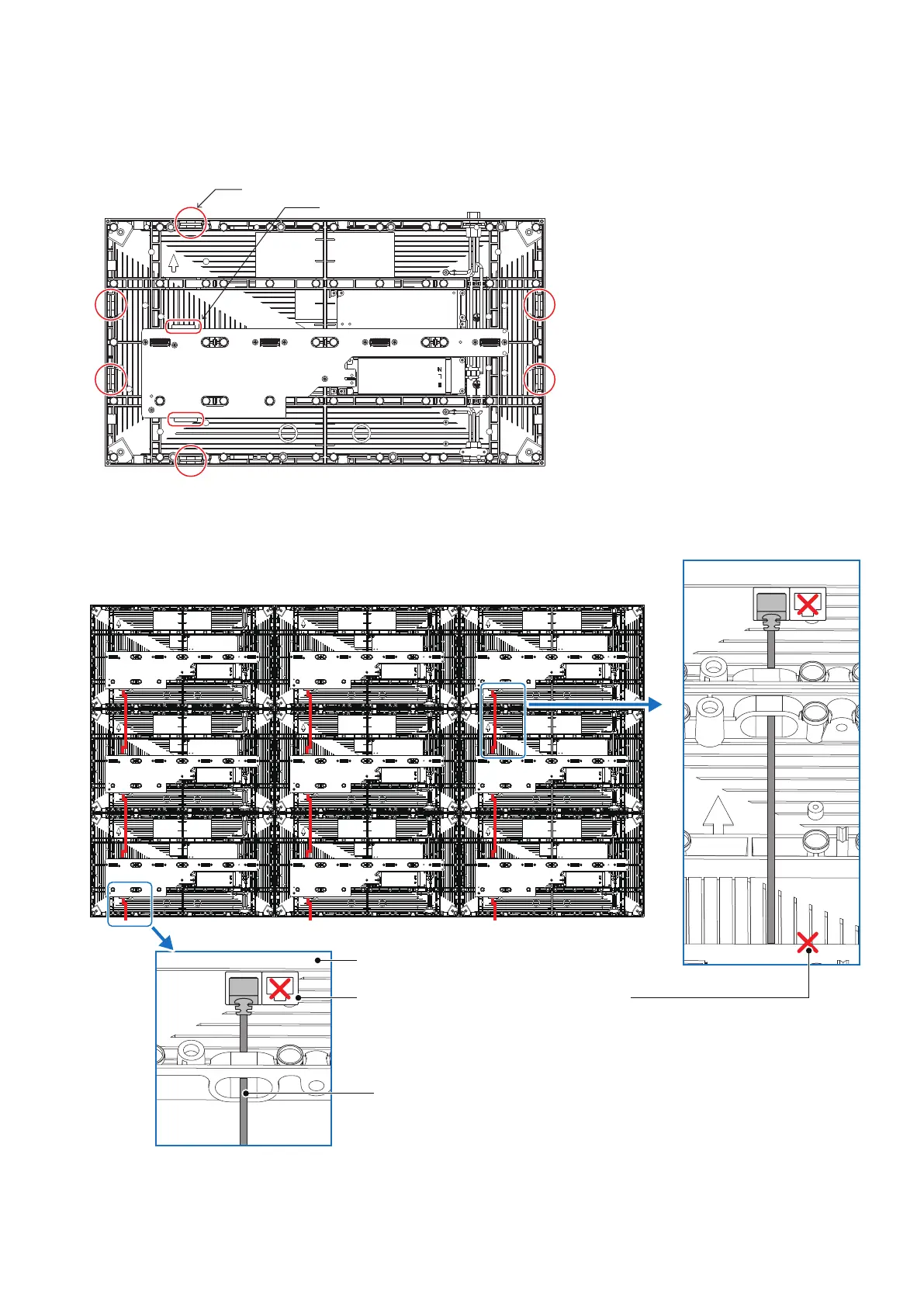 Connect the LAN cables for the signal between the LED displays. Use the through holes to pass the cables