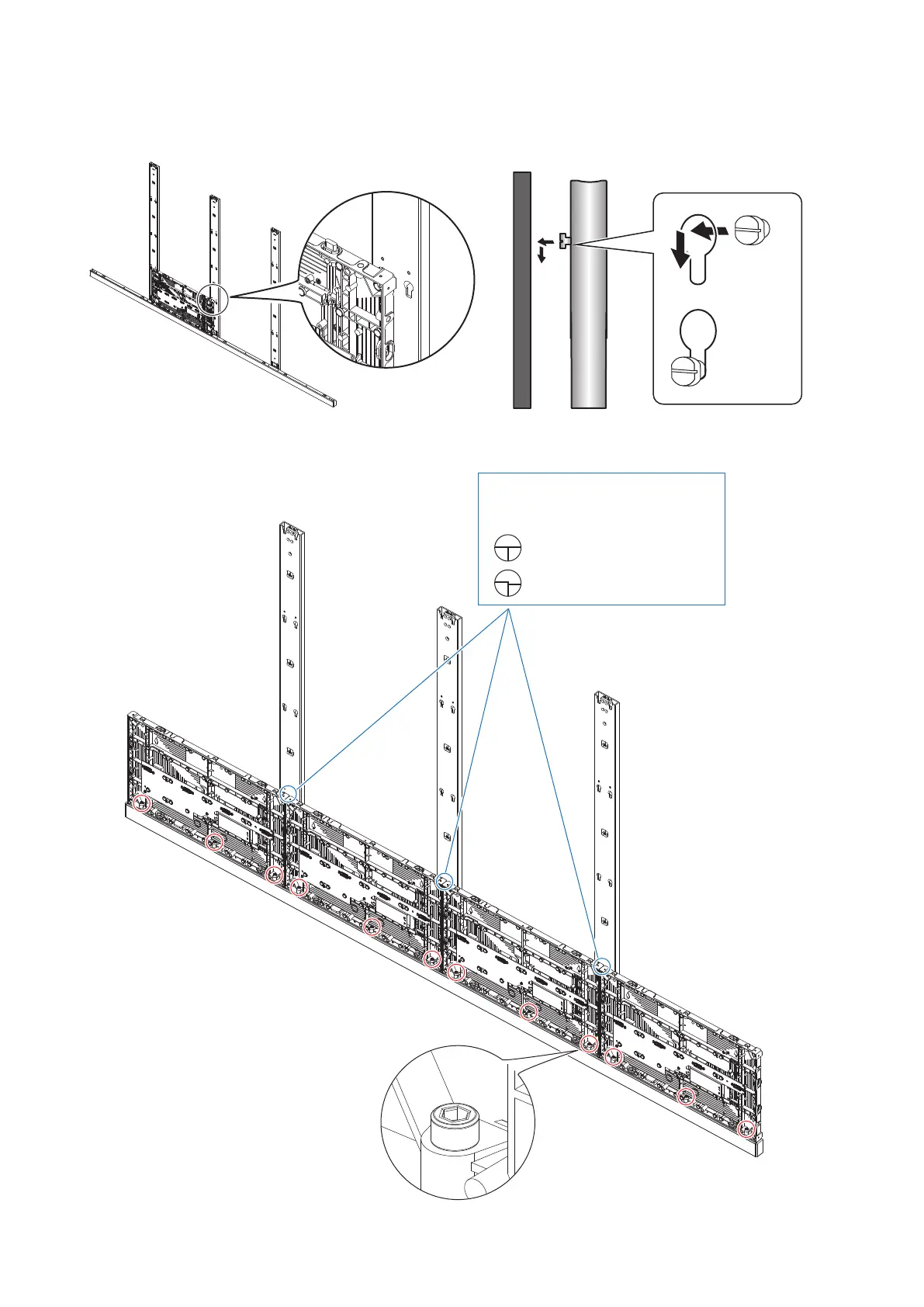 Hook the hanger pins, which have been inserted into the cabinets, into the holes on the mounting bars starting
