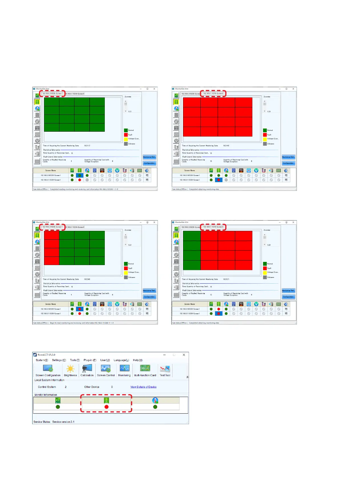 In the start-up screen of NovaLCT, the status indicator circle for “Monitor Information” receiving card becomes