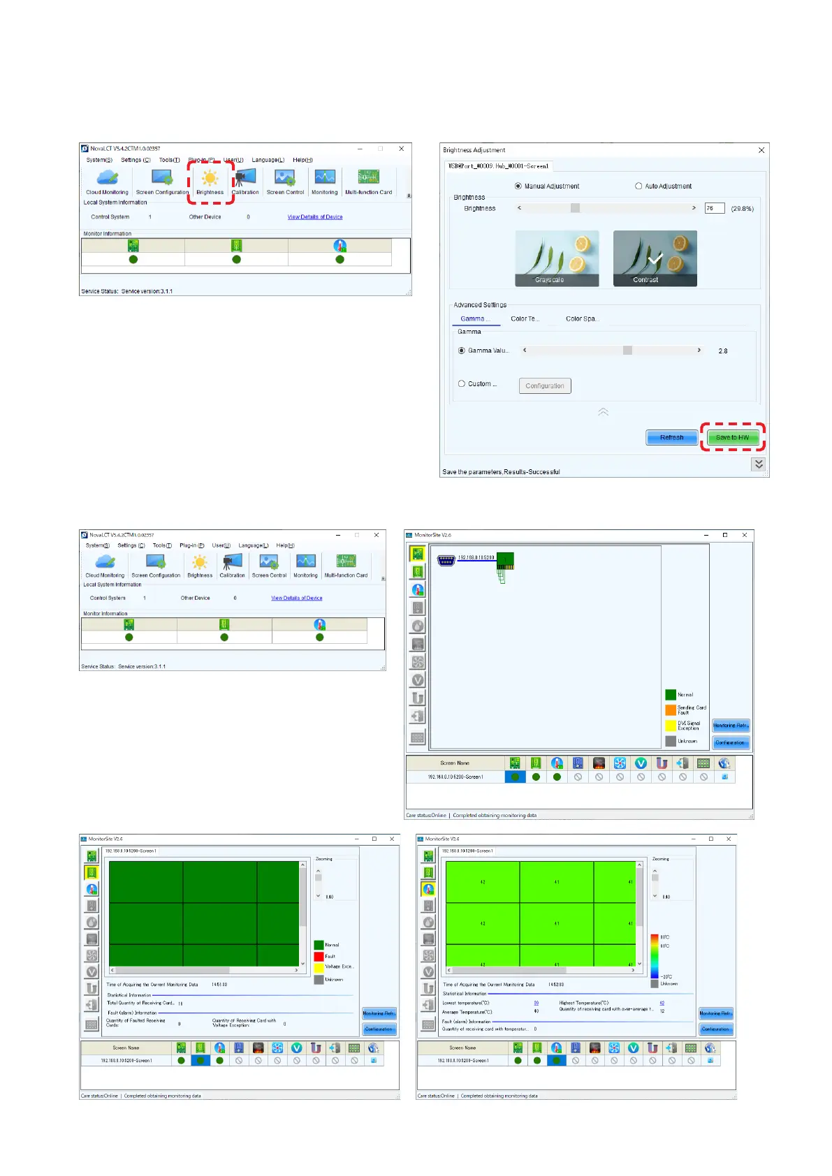 In the Brightness Adjustment screen, set the desired brightness value and click the “Save to HW” button.
