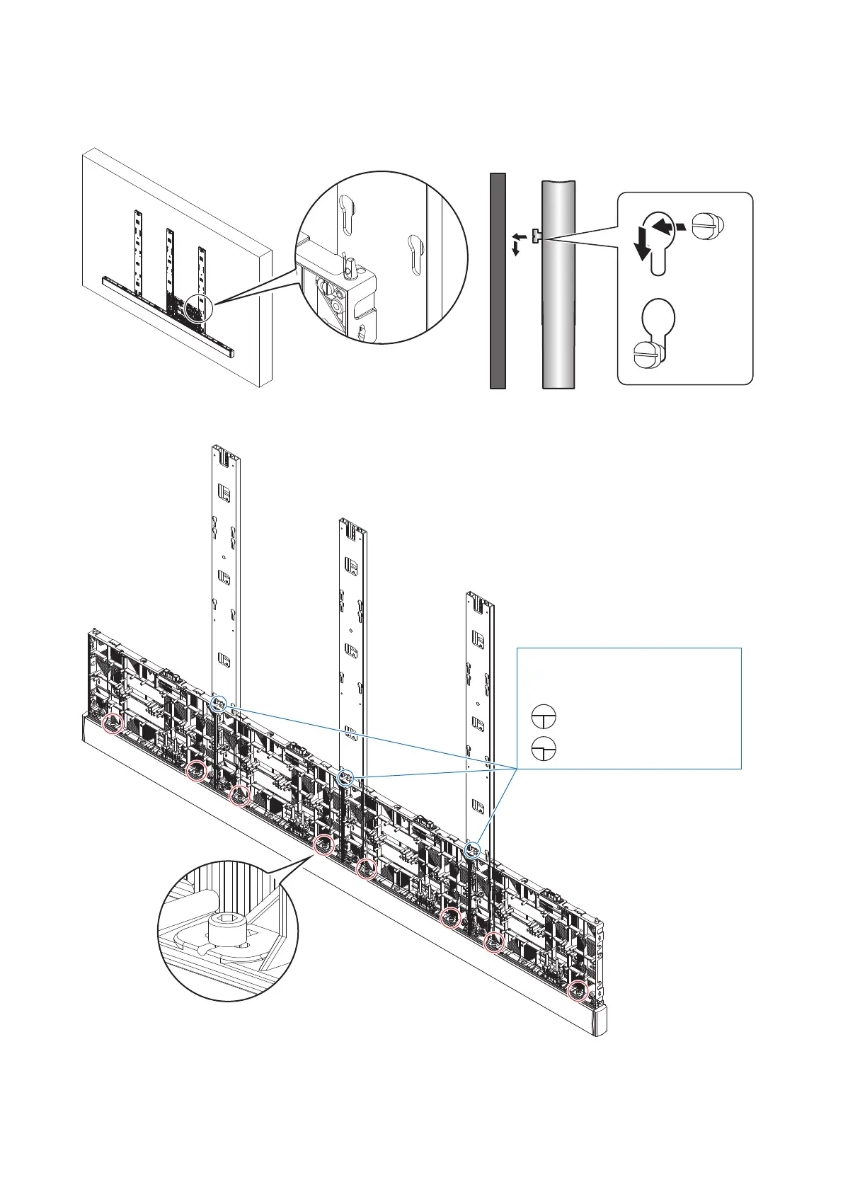 Hook the hanger pins, which have been inserted into the cabinets, into the holes on the mounting bars starting