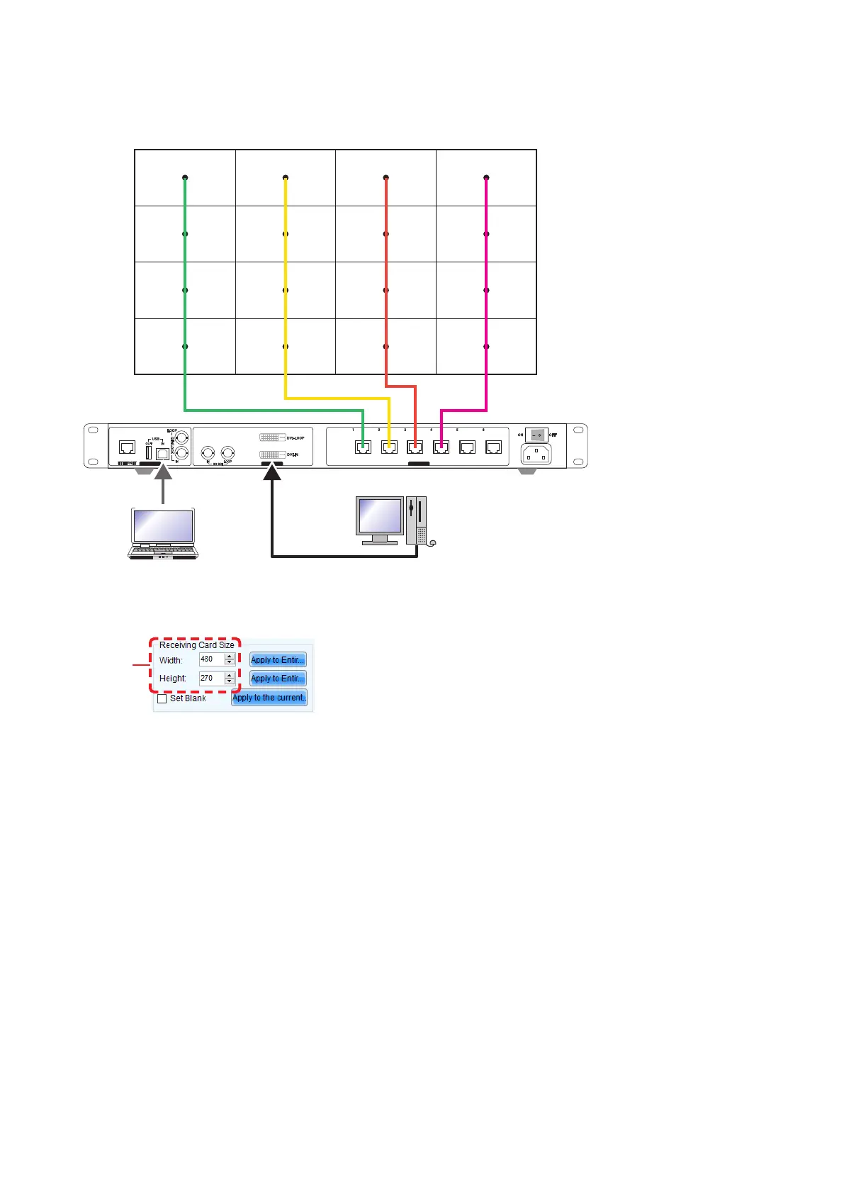 With a pixel pitch of 1.25 mm, enter Width=480 and Height=270 under “Receiver Card Size” (e).