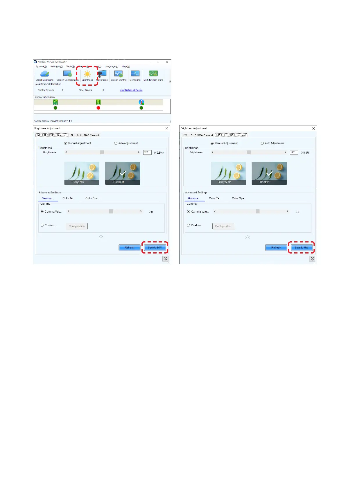 In the Brightness Adjustment screen, set the desired brightness value and click the “Save to HW” button.