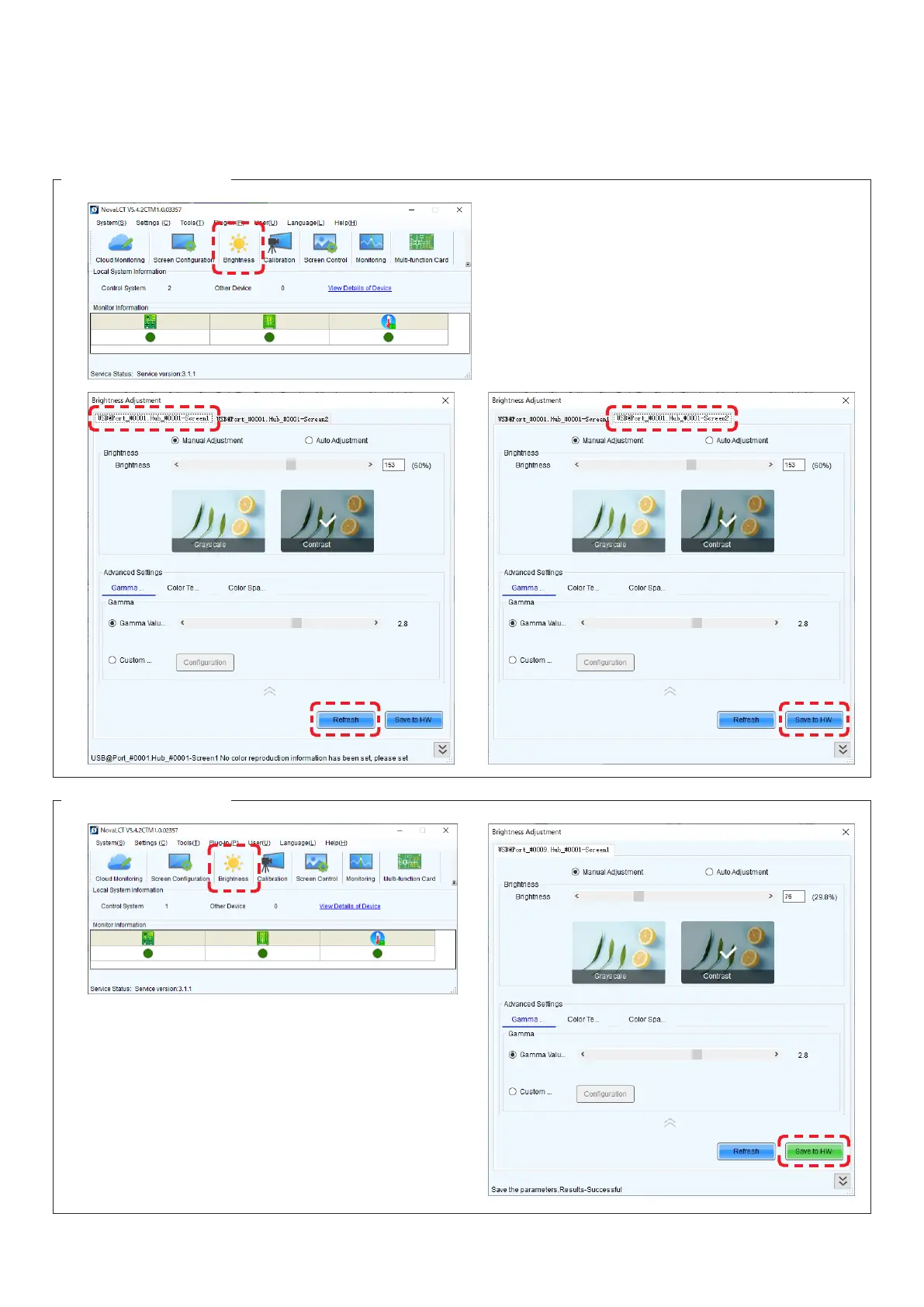 In the Brightness Adjustment screen, set the desired brightness value and click the “Save to HW” button.