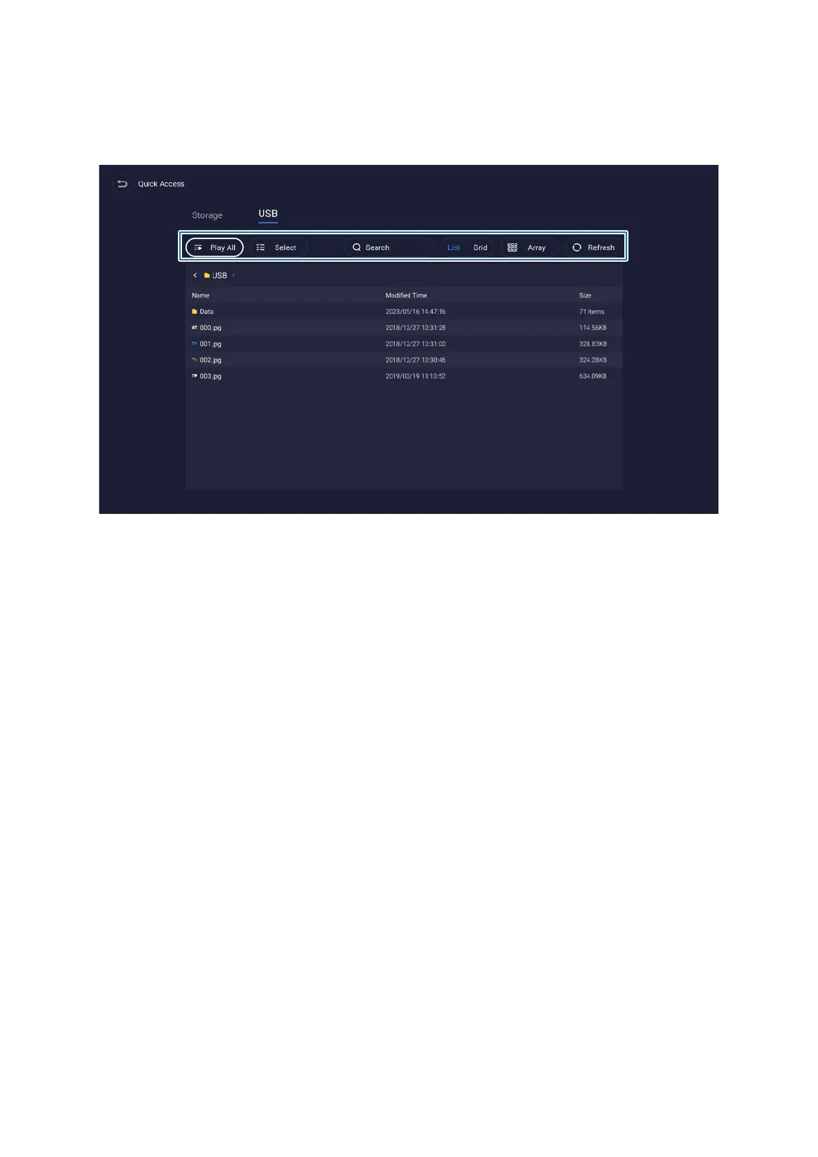 Navigate directly to the les in the internal storage or USB ash drive.