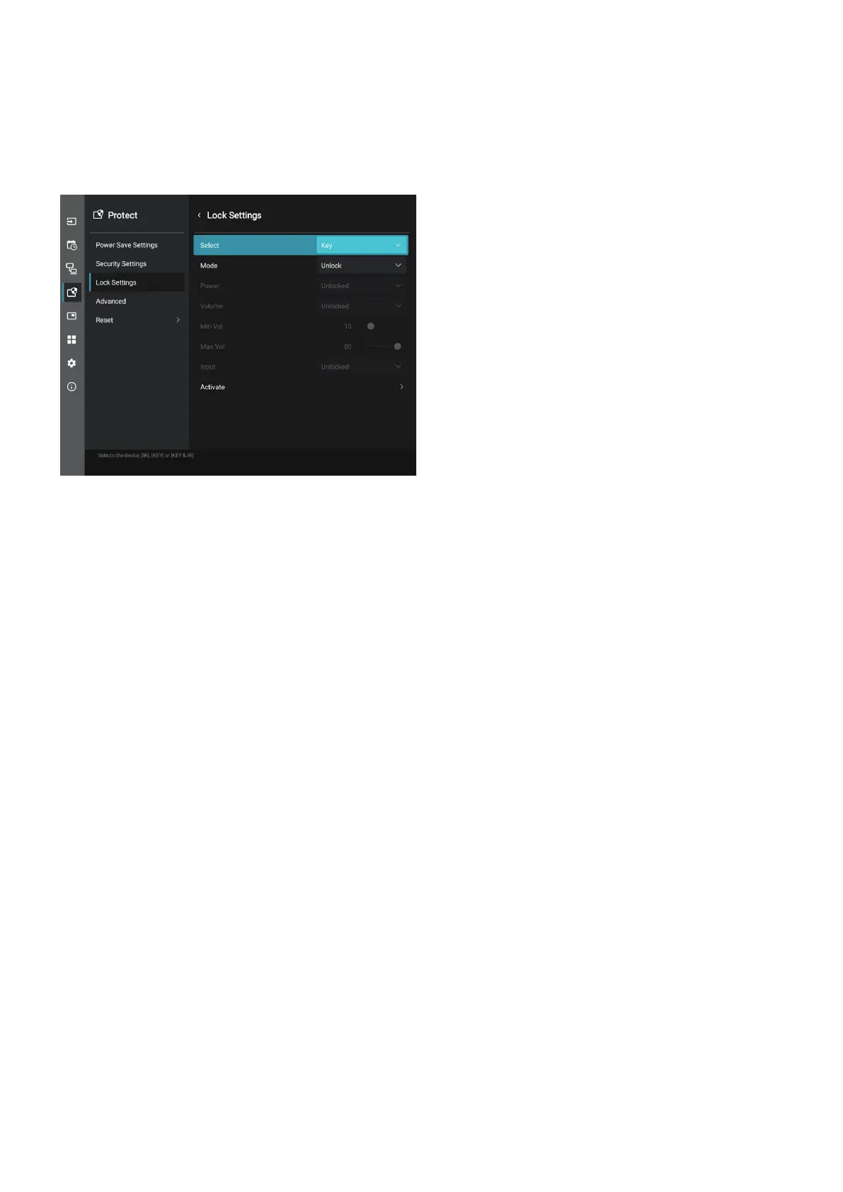 Select [Protect] ➙ [Lock Settings] ➙ [Select] ➙ [Key & IR] from the OSD menu.