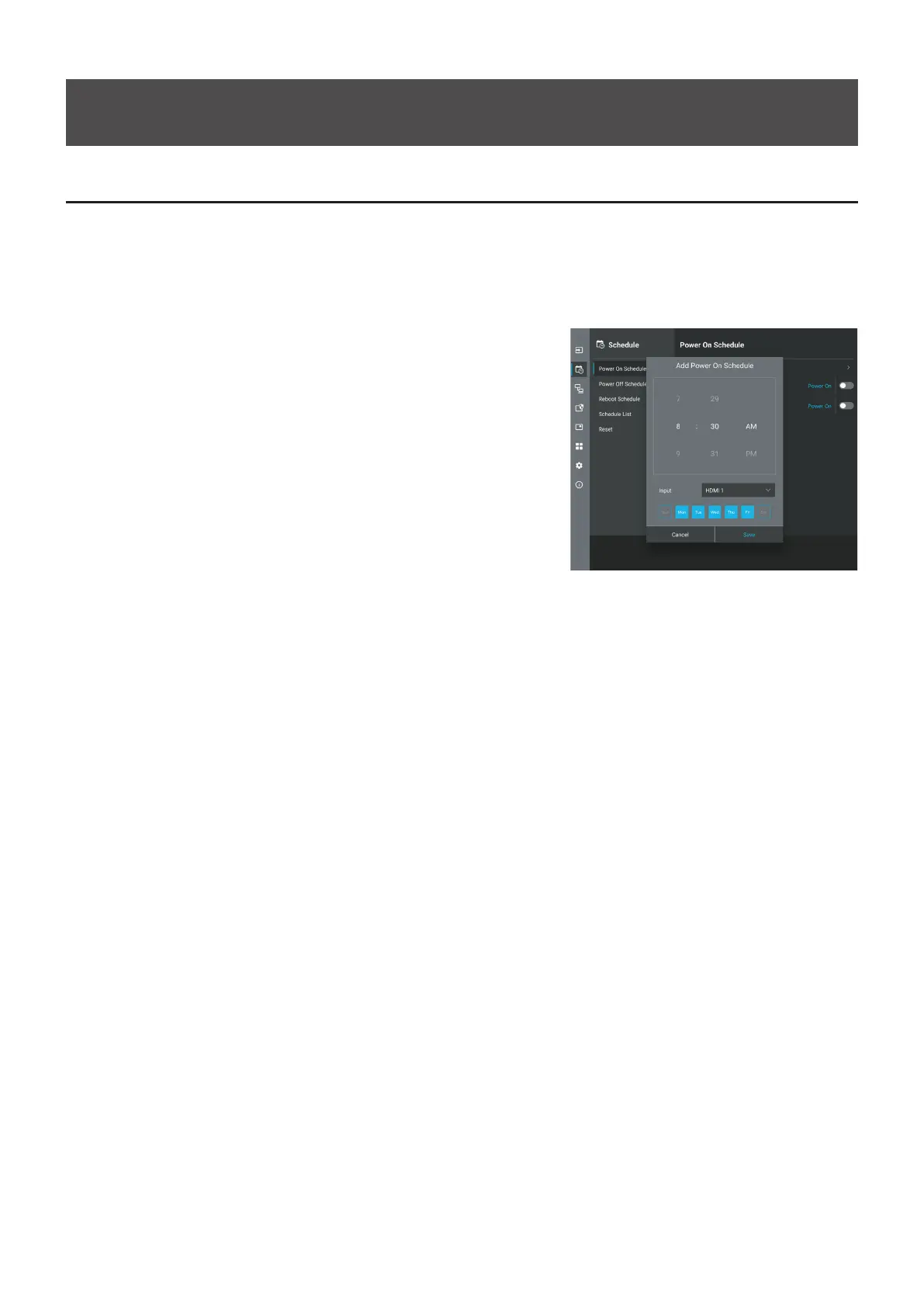 The schedule function allows the monitor to automatically change between power on and standby state at different times and