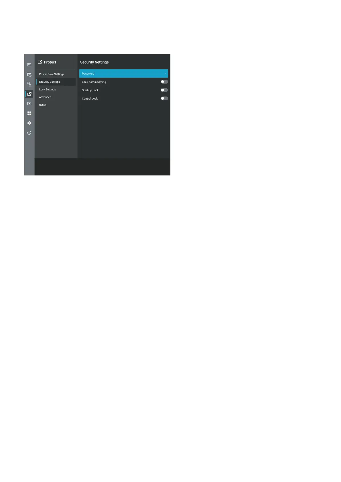 • [Control Lock] ................The password is required to use any of the remote control buttons or buttons on the monitor.