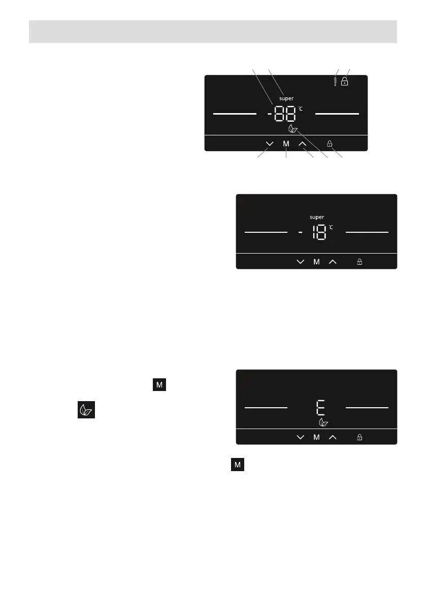 • Nach dem Signalton zeigt die Tiefkühltemperatur-Einstellung (1) „E“ an.