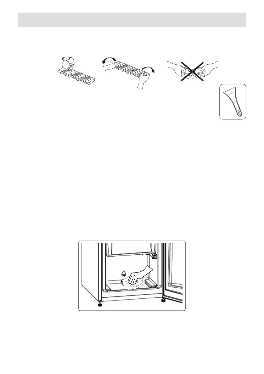 • Kun vesi on täysin jäätynyt, voit taivuttaa rasiaa alla olevan kuvion osoittamalla tavalla poistaaksesi jääkuutiot