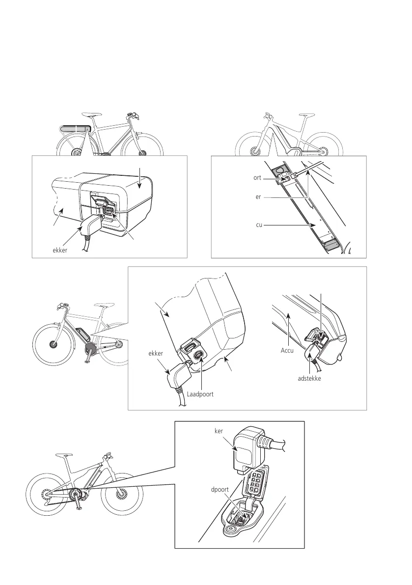 Laad de accu op met de acculader op de vloer of een ander stabiel oppervlak. Zet de fiets vast tijdens het opladen, zodat deze niet