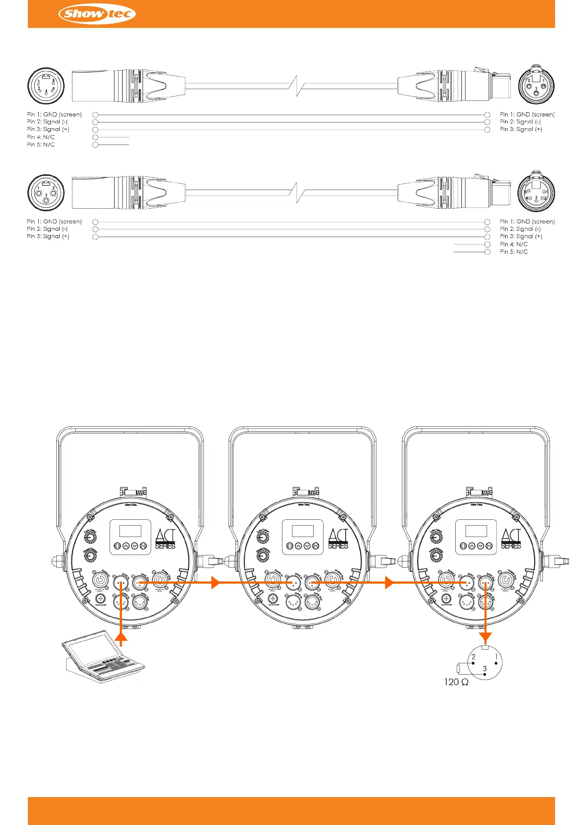 04) Sluit een DMX-terminator (weerstand van 120 Ω) aan op de DMX OUT-connector van het laatste apparaat04)