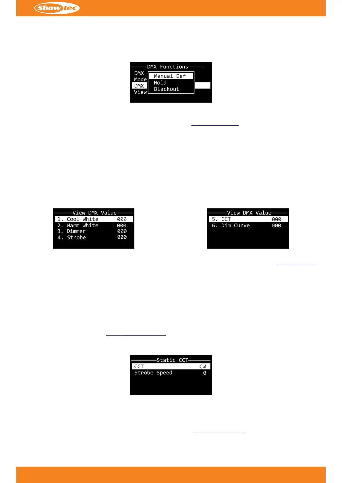 • in 6-kanaals DMX-modus: Koel wit, warm wit, dimmer, stroboscoop, CCT en dimcurve•