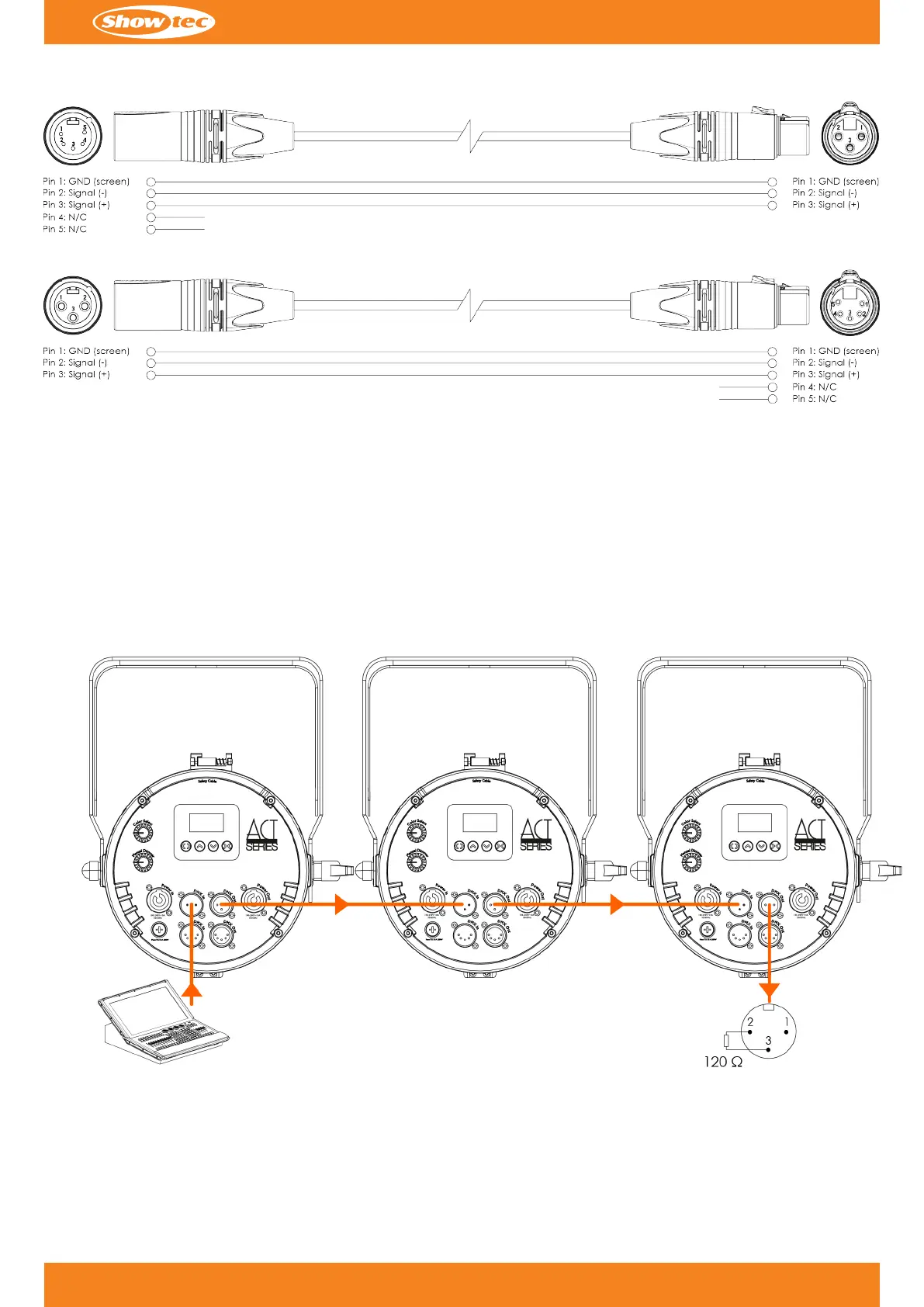 04) Connect a DMX terminator (120 Ω resistor) to the DMX OUT connector of the last device on the data link.04)