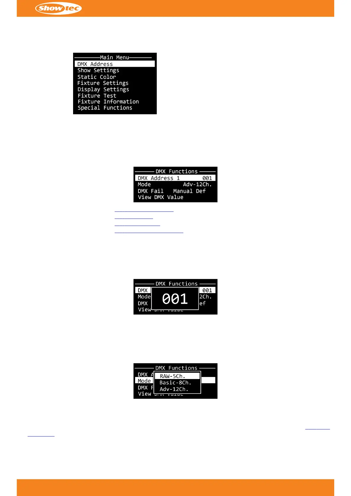 Press the UP/DOWN buttons to select the DMX channel mode. There are 3 options available: