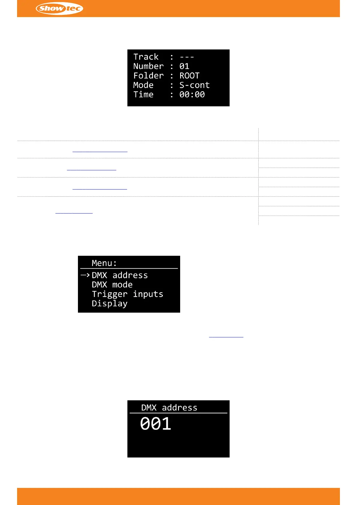 01) Press the UP/DOWN buttons to select the DMX starting address of the device. The selection range depends01)