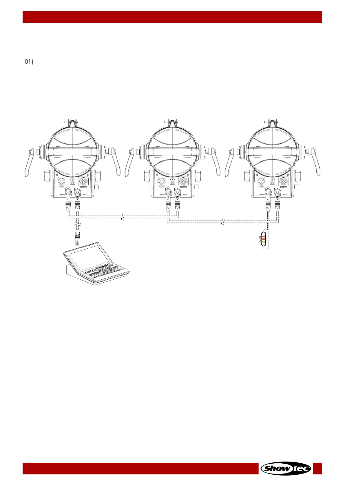 02) Verbind de DMX OUT-aansluiting van het eerste apparaat met de DMX IN-aansluiting van het