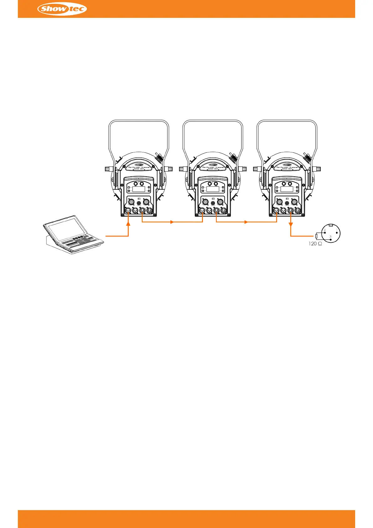 Connect a DMX terminator (120 Ω resistor) to the DMX OUT connector of the last device on the data link.