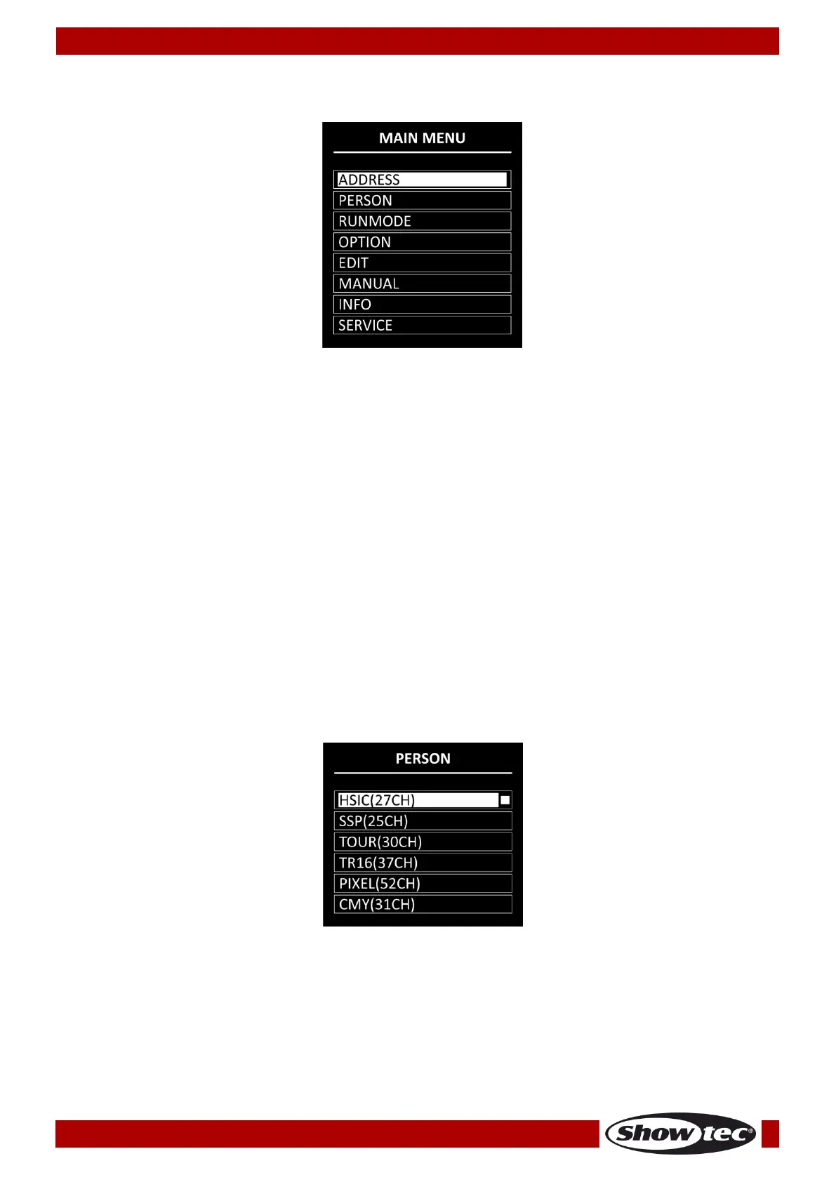 02) Press the ENTER button to confirm your choice. See pages 37–49 for the DMX channel modes.