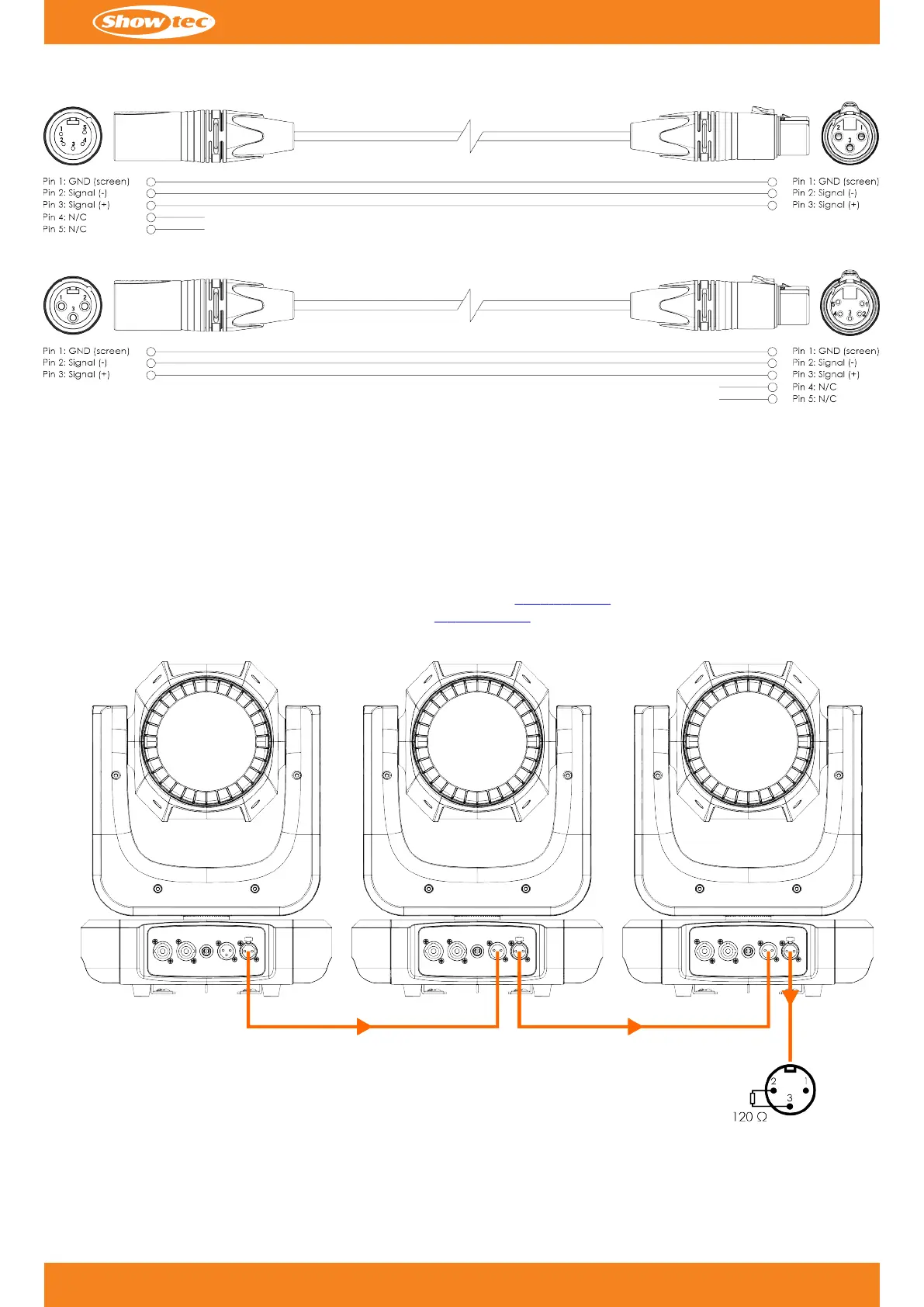 03) Connect a DMX terminator (120 Ω resistor) to the DMX OUT connector of the last device on the data link.03)