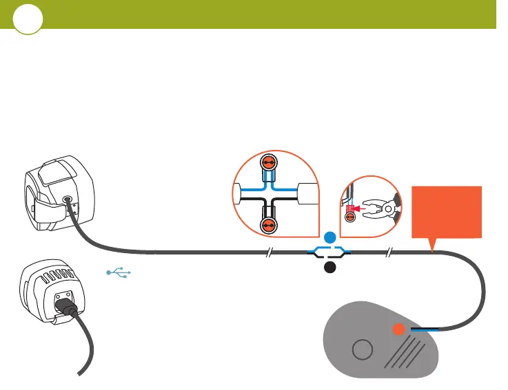 Savienošanai ar e-velosipēda akumulatoru jāizmanto iekšpusē iebūvēts dubultais kabelis (melnais vads = –, zilais vads = +).