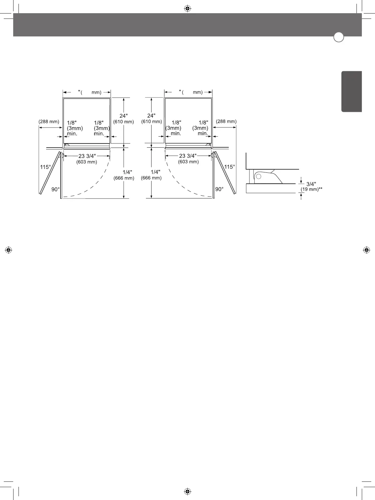 • The factory-set 115° door swing can be adjusted to 90° if clearance to adjacent cabinets or walls is