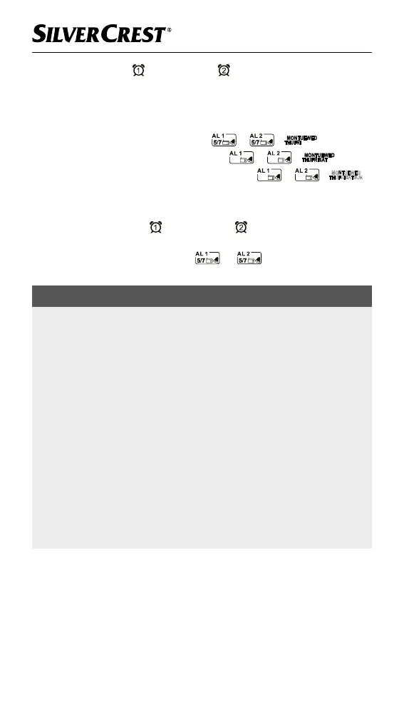 ► If alarm 1 or alarm 2 are activated, the days of the week on