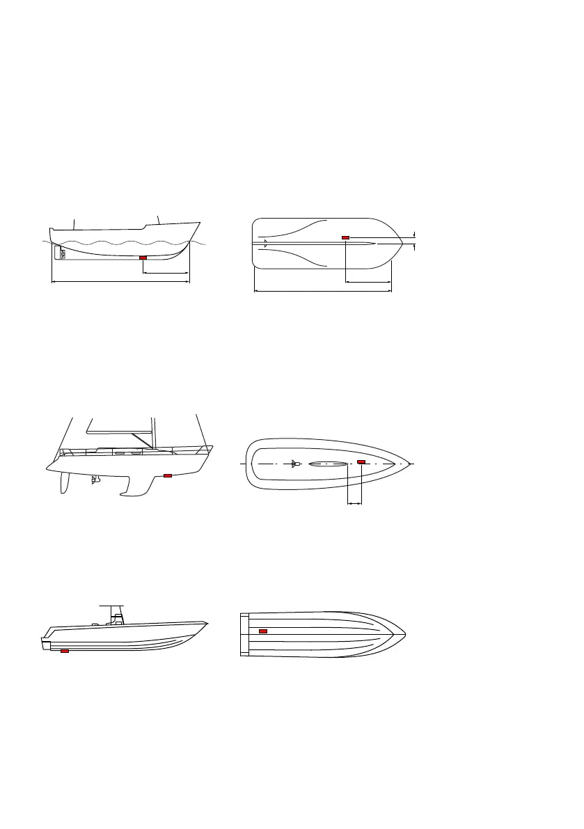 Install the transducer 300–600 mm (12–24 in) in front of the keel, at the point of minimum deadrise angle,