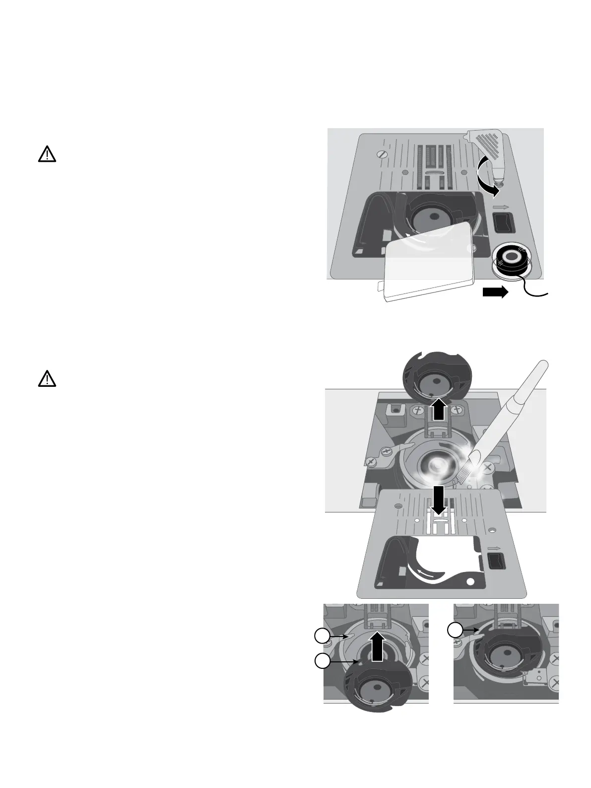 Guide the “forked” end of the bobbin case (A) under the bob-