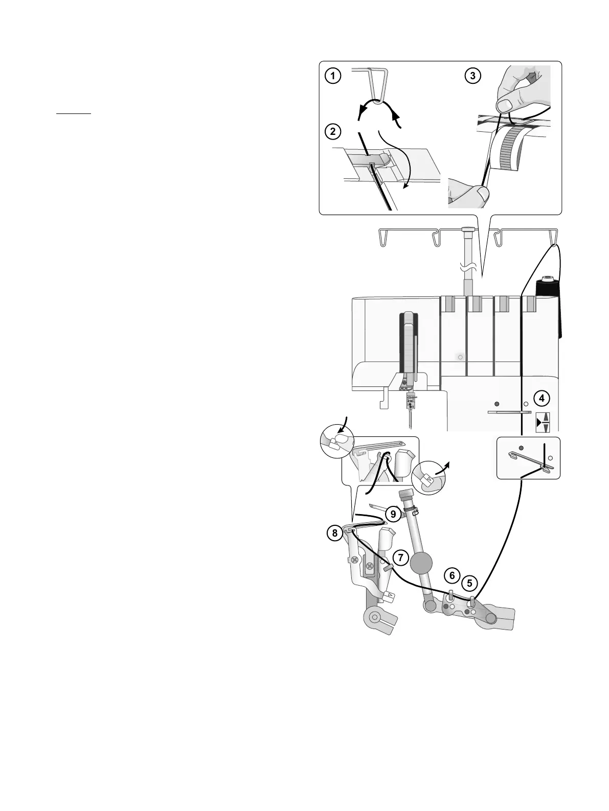 draadgeleider op de garenstandaard (1). Gebruik het pincet