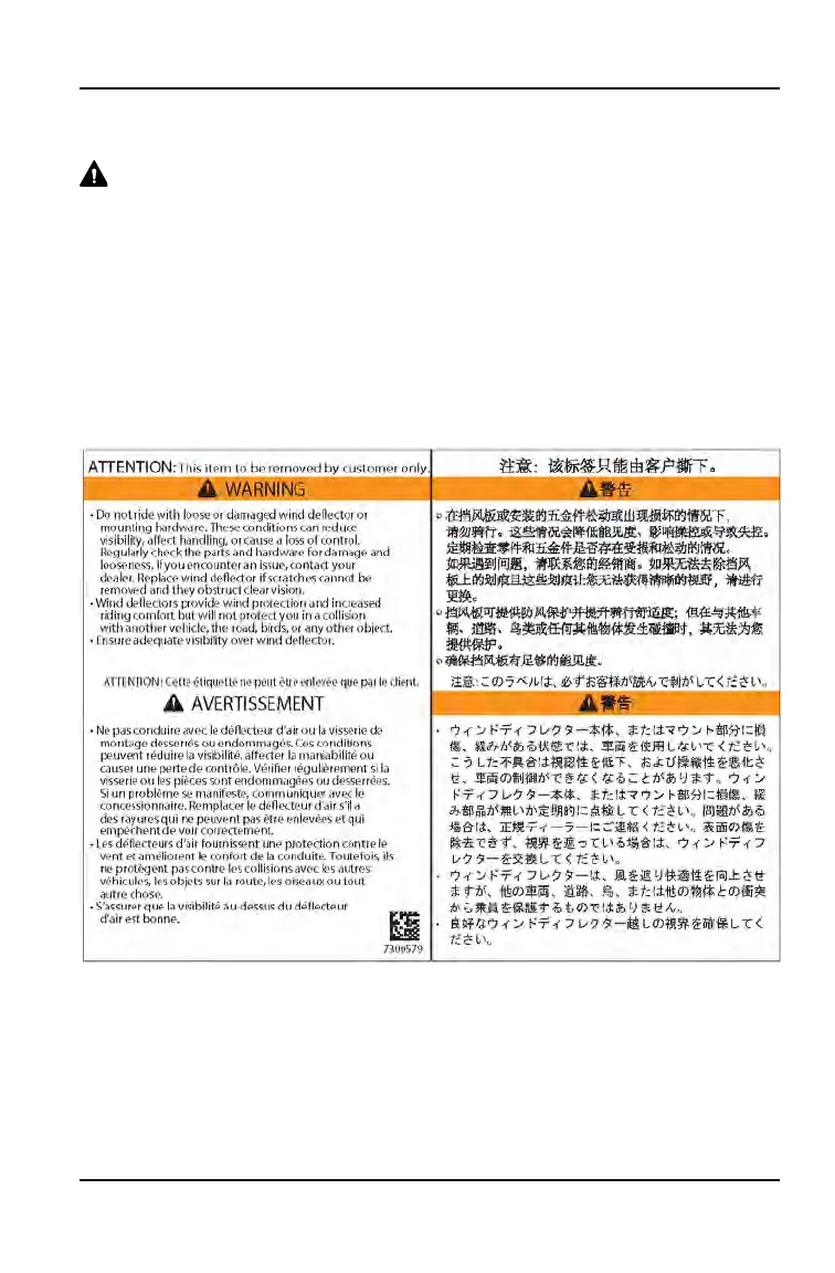 Do not ride with loose or damaged wind deflector or mounting hardware. These