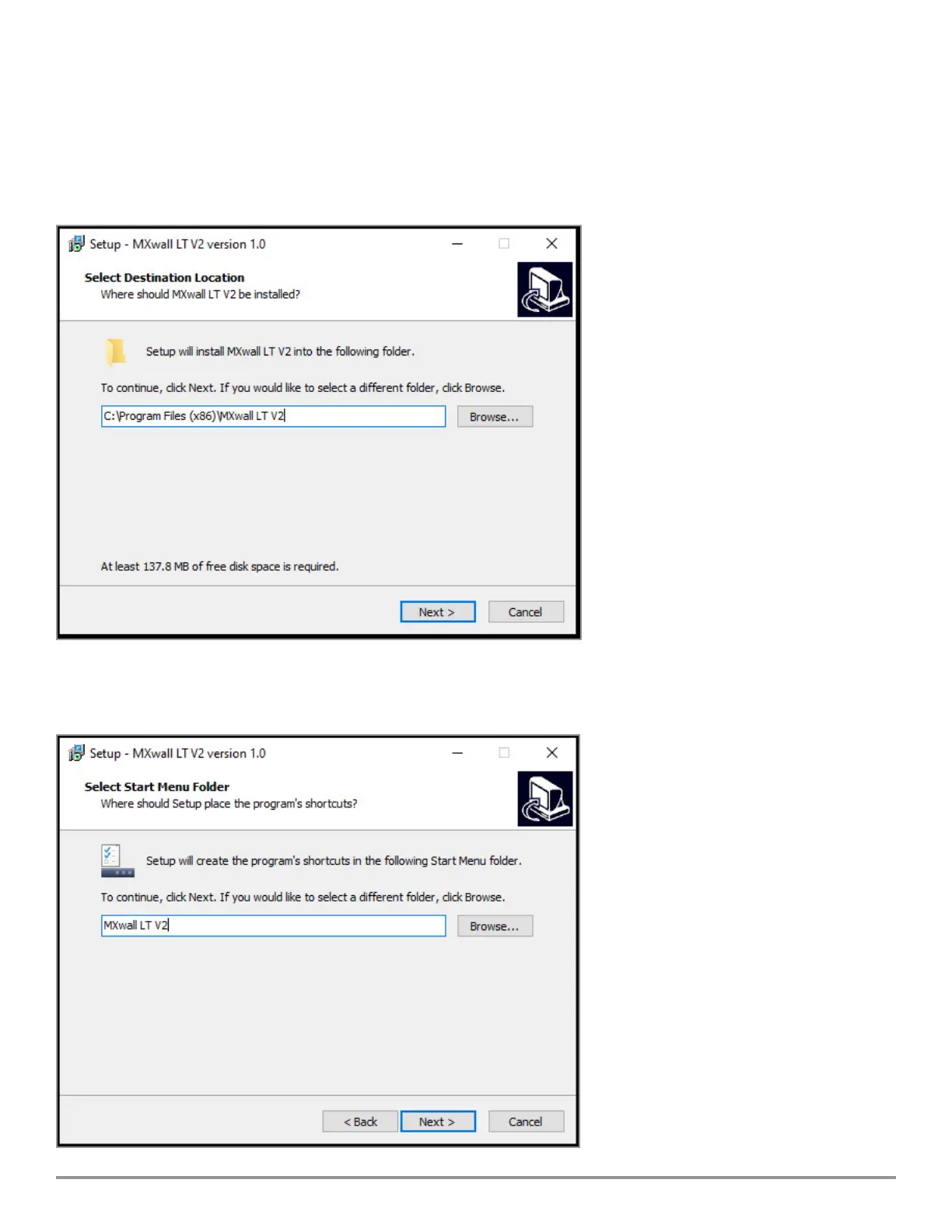 2. A Setup window will pop open. Select where you would like to save the MXwall LT V2 soware. It is