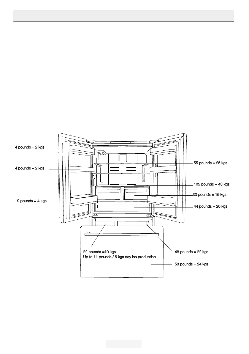 Ice container bin holds up to 10 kgs (22 pounds), it is for usage without ice. Freezer bin will hold up to 24