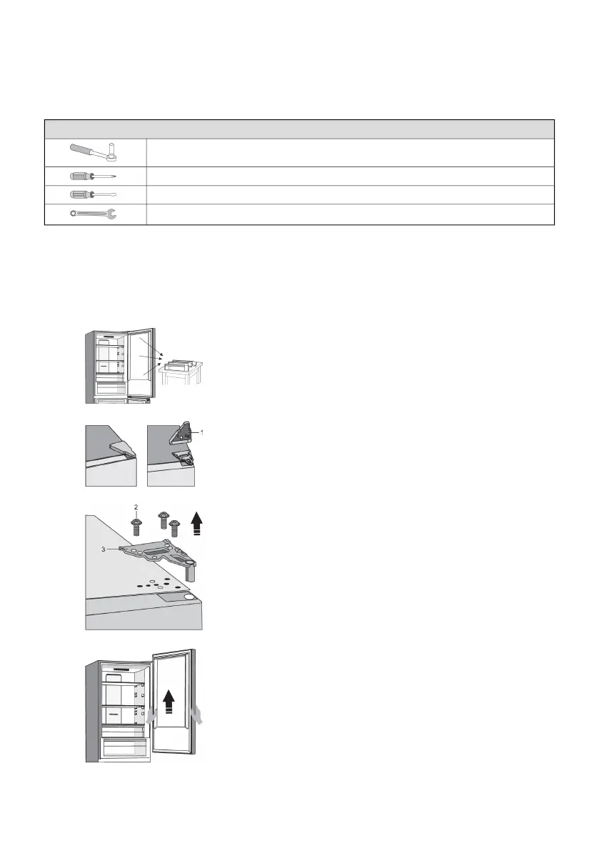 3. Undo the screws (2) and remove the hinge (3). Hold the door while